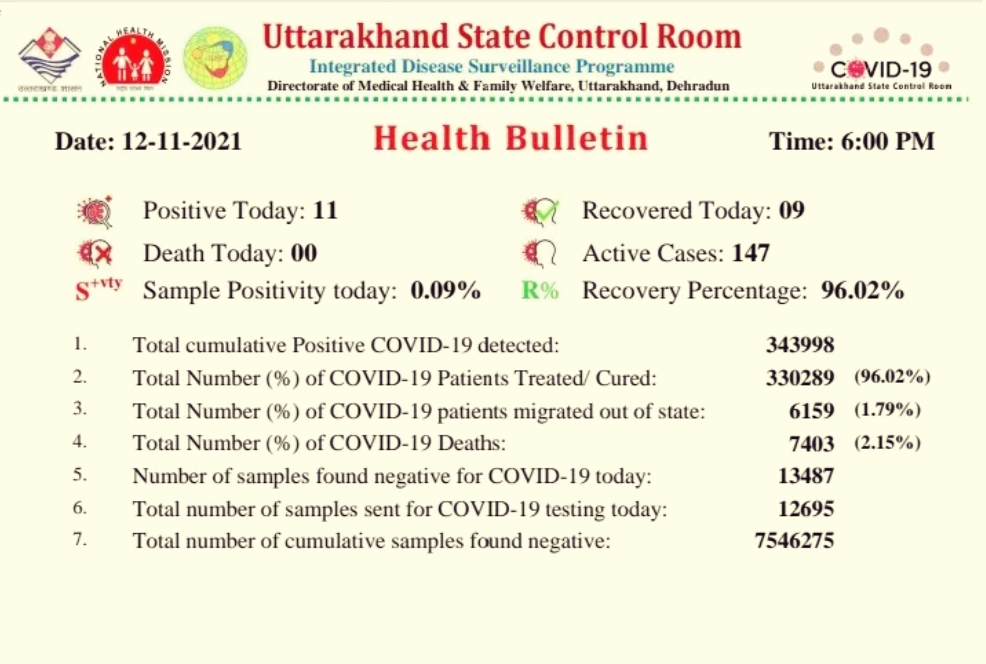 उत्तराखंड : प्रदेश में आज कोरोना के 11 नए संक्रमित, 9 मरीज ठीक होकर लौटे घर ।