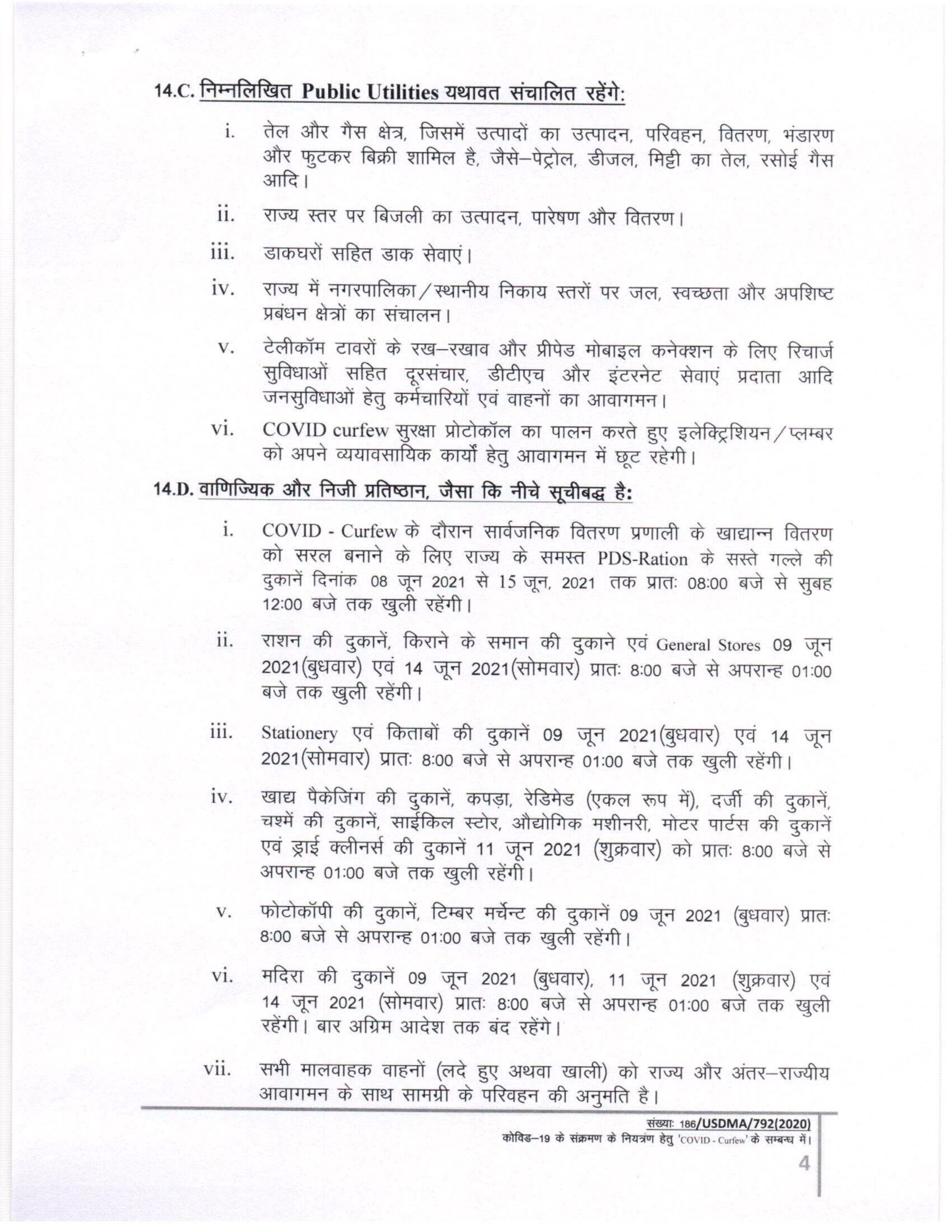 – फल, सब्जी, डेयरी, दूध, बैकरी, मांस, चिकन और मछली की बिक्री, उनके परिवहन, वेयर हाउसिंग व संबंधित गतिविधियां दैनिक आधार पर सुबह आठ से 12 बजे तक खुलेंगी।
