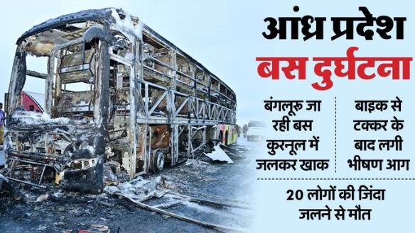 आंध्र प्रदेश के कुरनूल जिले के चिन्नातेकुर के निकट एक निजी बस में दोपहिया वाहन से टक्कर के बाद आग लग गई, जिससे इस हादसे में 20 लोगों की मौत हो गई।  पुलिस ने बताया कि मरने वालों में बाइक सवार एक व्यक्ति भी शामिल है। हादसे पर पीएम मोदी और राष्ट्रपति द्रौपदी मुर्मू ने शोक जताया है।