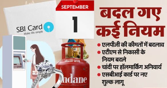 एक सितंबर यानी आज (सोमवार) से कई नियम बदल गए हैं। इनकी जगह अब नए नियम लागू हो गए हैं। इन नियमों से आपके घर के बजट और रोजमर्रा के खर्चों पर अच्छा खासा असर पड़ेगा। चांदी की हॉलमार्किंग, एलपीजी की कीमतों में संशोधन, एटीएम निकासी शुल्क और फिक्स्ड डिपॉजिट (एफडी) की ब्याज दरों में संभावित कमी जैसे बदलाव सीधे उपभोक्ताओं पर असर डालेंगे।