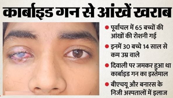 दीपावली पर प्लास्टिक से बनी कार्बाइड गन से पूर्वांचल के 65 बच्चों की आंखों की रोशनी चली गई है। इनकी रोशनी वापस लाने का अब सर्जरी ही विकल्प है। यूट्यूब पर देखकर 300 रुपये में प्लास्टिक के पाइप से बनाई इस गन का दो महीने पहले दिवाली पर जमकर उपयोग किया गया।