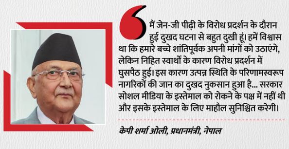 दिनभर हुई व्यापक हिंसा के बाद पीएम केपी शर्मा ओली ने भी अपने सुर बदल लिए। उन्होंने एक बयान जारी कर कहा कि मैं जेन-जी पीढ़ी के विरोध प्रदर्शन के दौरान हुई दुखद घटना से बहुत दुखी हूं। हमें विश्वास था कि हमारे बच्चे शांतिपूर्वक अपनी मांगों को उठाएंगे, लेकिन निहित स्वार्थों के कारण विरोध प्रदर्शन में घुसपैठ हुई। इस कारण उत्पन्न स्थिति के परिणामस्वरूप नागरिकों की जान का दुखद नुकसान हुआ है… सरकार सोशल मीडिया के इस्तेमाल को रोकने के पक्ष में नहीं थी और इसके इस्तेमाल के लिए माहौल सुनिश्चित करेगी।