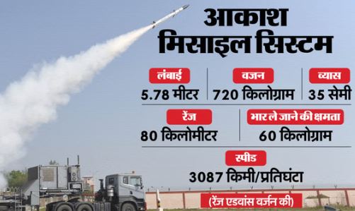 बता दें कि ‘आकाश’ मिसाइल सिस्टम को 3डी इलेक्ट्रानिक स्कैनिंग रडार से लैस किया गया है। इसकी प्रत्येक बैट्री में चार लांचर होते हैं। प्रत्येक में कम से कम 3 सतह से हवा में मार करने वाली मिसाइल लगी होती हैं। इसकी इंटरसेप्शन रेंज, 30 किलोमीटर तक रहती है। इसके अलावा यह मिसाइल, 18,000 मीटर तक की ऊंचाई वाले लक्ष्यों को भेद सकती है। ‘आकाश’, 2.5 मैक तक की सुपरसोनिक गति से अपने टारगेट की तरफ बढ़ती है।