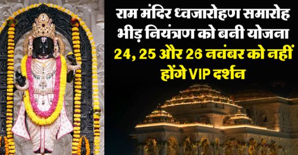 अयोध्या स्थित राम मंदिर में 25 नवंबर को होने वाले ध्वजारोहण समारोह के लिए तैयारियां तेज कर दी गई हैं। इसको देखते हुए राम मंदिर ट्रस्ट ने यह निर्णय लिया है कि ध्वजारोहण समारोह के एक दिन पहले यानी 24 नवंबर और एक दिन बाद यानी 26 नवंबर को राम मंदिर में वीआईपी दर्शन पर रोक रहेगी। भीड़ नियंत्रण के लिए यह योजना बनाई गई है।