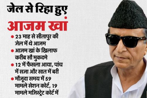 जिला कारागार से 23 माह बाद मंगलवार करीब 12:20 बजे आजम खां रिहा हो गए हैं। जिला कारागार से दो गाड़ियां बाहर आई हैं। एक गाड़ी में आजम खां चार लोगों के साथ बैठे हैं। इनमें उनके पुत्र अदीब, अब्दुल्ला, उनके प्रतिनिधि व दो अन्य लोग हैं। दूसरी गाड़ी में आजम खां का सामान है। यह वही सामान है, जो उनके साथ कारागार में था। इनमें उनकी किताबें, कपड़े व अन्य सामान शामिल है।