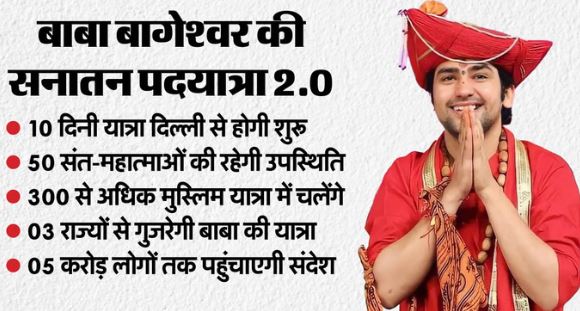 बागेश्वर धाम पीठाधीश्वर पं. धीरेंद्र कृष्ण शास्त्री के नेतृत्व में इंद्रप्रस्थ यानि दिल्ली से वृंदावन तक 10 दिनी सनातन हिंदू एकता पदयात्रा शुक्रवार सुबह नौ बजे रवाना होगी। साधु संतों द्वारा सौंपे गए धर्म ध्वज को आगे रखकर शुरू होने वाली इस पदयात्रा की शुरुआत से पूर्व देशभर से दिल्ली पहुंचने वाले महामंडलेश्वरों, आचार्यों के आशीर्वचनों की वर्षा के बाद राष्ट्रगान, हनुमान चालीसा का पाठ और हिंदू एकता की शपथ के कार्यक्रम होंगे।