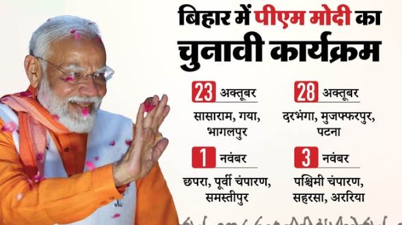 प्रधानमंत्री नरेंद्र मोदी कल 23 अक्तूबर से बिहार में चुनावी जनसभाओं की शुरुआत करेंगे। पीएम मोदी भाजपा के सबसे बड़े नेता हैं और उनकी चुनावी रैलियों से पूरी चुनावी हवा बदलती रही है। इसे देखते हुए भाजपा ने पीएम की रैलियों को सफल बनाने में पूरी ताकत झोंक दी है। पार्टी के चुनाव प्रभारी और केंद्रीय मंत्री धर्मेंद्र प्रधान के साथ बिहार भाजपा की टीम ने इन जनसभाओं को सफल बनाने की जिम्मेदारी संभाली है। पीएम की हर जनसभा से आसपास की लगभग एक दर्जन विधानसभा सीटों पर असर पड़ने की संभावना है। लिहाजा हर रैली में आसपास के इलाकों से लोगों को लाकर जनसभाओं को सफल बनाने की रणनीति अपनाई गई है।