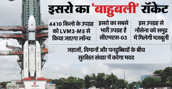 भारत का बाहुबली प्रक्षेपण यान एलवीएम-3 आज अपनी पांचवीं परिचालन उड़ान भरने वाला है। इस बार वह धरती से भेजने जाने वाला सबसे भारी संचार उपग्रह सीएमएस-03 को अंतरिक्ष में लेकर जाएगा। भारतीय नौसेना का जीसैट 7R (सीएमएस-03) अब तक का सबसे उन्नत संचार उपग्रह होगा। यह मल्टी बैंड संचार उपग्रह पूरे उपमहाद्वीप के विशाल समुद्री क्षेत्र में संचार नेटवर्क को मजबूत करेगा और भारतीय नौसेना के लिए पैनी नजर बनाए रखना संभव बनाएगा।