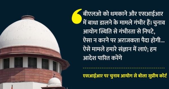 मुख्य न्यायाधीश जस्टिस सूर्यकांत और जॉयमाल्या बागची की पीठ ने चुनाव आयोग से कहा, ‘वह एसआईआर के काम में अलग-अलग राज्य सरकारों की तरफ से सहयोग की कमी को गंभीरता से लें।’ सर्वोच्च अदालत ने कहा, अगर हालात और बिगड़ते हैं तो पुलिस तो तैनात करने के अलावा कोई रास्ता नहीं बचेगा। इस पर चुनाव आयोग ने कहा कि उनके पास सभी सांविधानिक शक्तियां हैं, जिससे हम बीएलओ और अन्य अधिकारियों को धमकाने की घटनाओं से डील कर सकते हैं। इस पर सुप्रीम कोर्ट ने कहा ‘चुनाव पैनल चुनाव प्रक्रिया शुरू होने तक पुलिस को अपने अधिकार क्षेत्र में नहीं ले सकता। इससे निपटें वरना इन हालातों से अराजकता हो सकती है।’