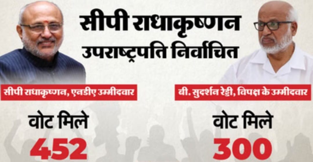 नडीए के उम्मीदवार सीपी राधाकृष्णन देश के नए उपराष्ट्रपति निर्वाचित हुए हैं। आज हुए मतदान में सीपी राधाकृष्णन को कुल 452 वोट मिले। वहीं विपक्षी गठबंधन इंडिया के उम्मीदवार सुदर्शन रेड्डी को 300 वोट मिले। राधाकृष्णन ने 152 वोटों के अंतर से जीत दर्ज की। उपराष्ट्रपति चुनाव में हार के बाद बी सुदर्शन रेड्डी ने कहा, मैं नवनिर्वाचित उपराष्ट्रपति सी पी राधाकृष्णन को उनके कार्यकाल की शुरुआत के लिए शुभकामनाएं देता हूं। हालांकि परिणाम मेरे पक्ष में नहीं है, फिर भी वैचारिक लड़ाई और अधिक जोश के साथ जारी रहेगी।