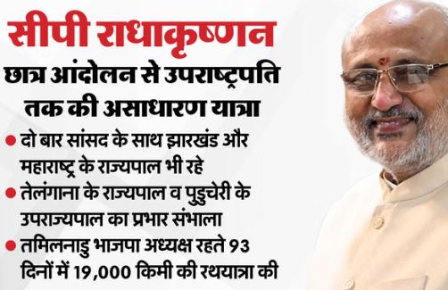 ओबीसी समुदाय कोंगु वेल्लार (गाउंडर) से आने वाले राधाकृष्णन की शादी सुमति से हुई है और उनके एक बेटा व एक बेटी हैं। उपराष्ट्रपति पद के लिए एनडीए के प्रत्याशी चुने जाने से पहले तक वह महाराष्ट्र के राज्यपाल थे। वह पिछले साल जुलाई में महाराष्ट्र के राज्यपाल बने थे। इससे पहले, फरवरी 2023 में उन्हें झारखंड का राज्यपाल नियुक्त किया गया था। झारखंड के राज्यपाल रहते उन्होंने तेलंगाना के राज्यपाल और पुडुचेरी के उप राज्यपाल का अतिरिक्त कार्यभार संभाला। राधाकृष्णन ने दक्षिण भारत में भाजपा के विकास में महत्वपूर्ण भूमिका निभाई।