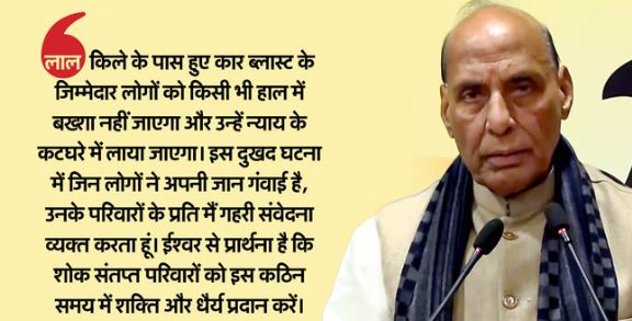 दिल्ली के लाल किले के पास हुए कार ब्लास्ट को लेकर रक्षा मंत्री राजनाथ सिंह ने सख्त रुख अपनाया है। उन्होंने कहा कि इस हादसे के जिम्मेदार लोगों को किसी भी हाल में बख्शा नहीं जाएगा और उन्हें न्याय के कटघरे में लाया जाएगा। राजनाथ सिंह ने कहा दिल्ली में कल हुई दुखद घटना में जिन लोगों ने अपनी जान गंवाई है, उनके परिवारों के प्रति मैं गहरी संवेदना व्यक्त करता हूं। ईश्वर से प्रार्थना है कि शोक संतप्त परिवारों को इस कठिन समय में शक्ति और धैर्य प्रदान करें।