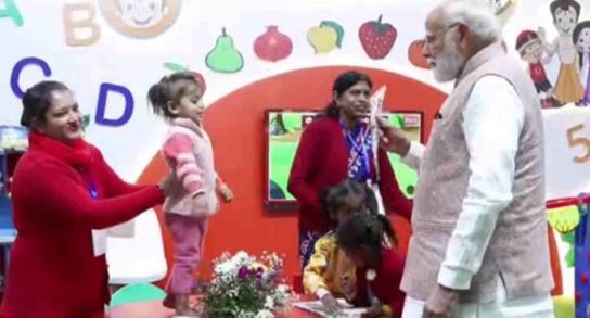 बच्चे बोले मोदी जी। काजल ने पीएम मोदी को गुलाब भेंट किया। आंगनबाड़ी केंद्र की हेल्पर शिखा कहती है कि हमारा सौभाग्य है कि उन्हें प्रधानमंत्री मोदी से मिलने का अवसर मिला। प्रधानमंत्री ने बच्चों से पूछा आप क्या करते हैं, बच्चों ने बताया ड्राईंग बनाते हैं।