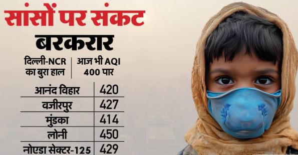 शुक्रवार को रिकॉर्ड किए गए एवरेज 364 एक्यूआई से थोड़ा सुधार होने के बावजूद सुबह-सुबह कुछ इलाकों में जहरीले स्मॉग की परत छाई रही। कुछ इलाकों में एक्यूआई 400 पार भी गया है, जिससे वहां की हवा ‘गंभीर’ श्रेणी में मानी जा रही है। लगातार बने स्मॉग (धुंध) की वजह से सांस लेने में दिक्कत हो रही है। उधर, नोएडा-गाजियाबाद समेत एनसीआर के कई इलाकों में भी हवा की गुणवत्ता खराब है।