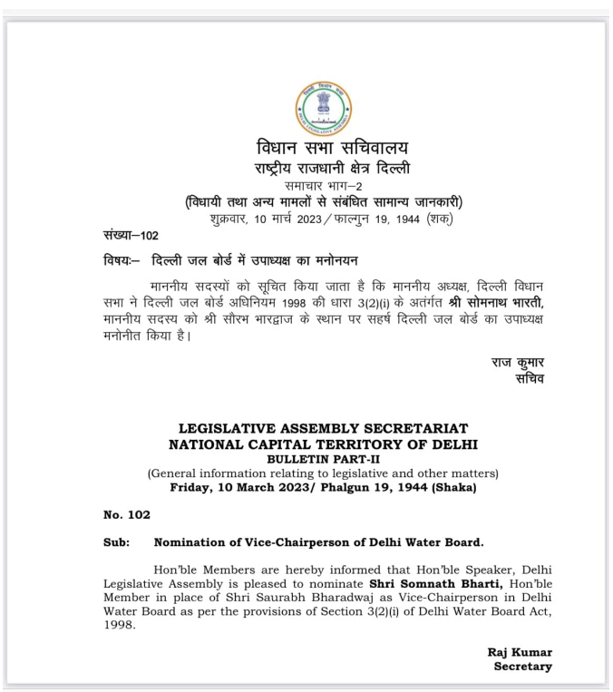 दिल्ली- सोमनाथ भारती को बनाया गया दिल्ली जल बोर्ड का उपाध्यक्ष |