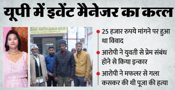 बरेली में 12 जनवरी से लापता बारादरी इलाके की निवासी इवेंट मैनेजर पूजा राना (30) की गला दबाकर हत्या कर दी गई। हत्या के आरोप में फिजियोथेरेपिस्ट विमल को पुलिस ने पैर में गोली मारकर गिरफ्तार कर लिया। शव का पैनल से पोस्टमॉर्टम कराया गया।