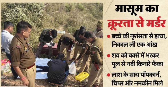 दिल्ली-लखनऊ हाईवे पर मंगलवार सुबह नकटिया नदी पुल के नीचे लाल रंग के बक्से में आठ साल के बच्चे का शव मिला, जिसकी बांयी आंख निकाली गई थी। बक्से में पॉपकार्न और नमकीन के भरे हुए पाउच थे। स्थानीय लोगों की सूचना पर इज्जतनगर थाना पुलिस, फॉरेंसिक टीम व एसपी सिटी पहुंच गए। बच्चे की कहीं और हत्या कर शव फेंकने की बात सामने आ रही है। पहचान के लिए शव रखा गया है, बाद में ही पोस्टमॉर्टम किया जाएगा।