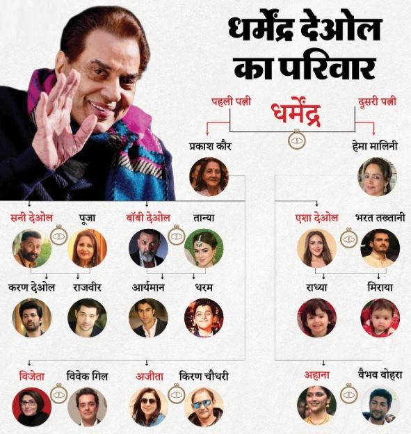 बॉलीवुड के दिग्गज अभिनेता धर्मेंद्र का आज सोमवार को निधन हो गया है। उनके परिवार के लोग और उनके करीबी सदमे में हैं। ऐसे में धर्मेंद्र के फैंस उनके परिवार के बारे में जानना चाहते हैं। धर्मेंद्र का परिवार बॉलीवुड के सबसे बड़े परिवारों में से एक है। उन्होंने दो शादियां की थीं और उनके कुल छह बच्चे हैं।