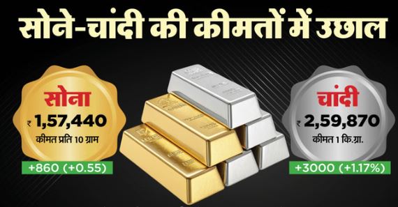 Gold-Silver- चांदी की कीमतों में ₹3000 का उछाल, सोना ₹1.57 लाख पर पहुंचा