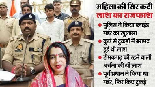 यूपी के झांसी के टोड़ी फतेहपुर के किशोरपुरा गांव में मिली युवती की सिर कटी लाश के मामले में पुलिस ने सनसनीखेज खुलासा किया है। बुधवार को एसएसपी बीबी जीटीएस मूर्ति ने बताया कि युवती की हत्या प्रेम प्रसंग के चलते उसके प्रेमी एवं महेबा (टोड़ी फतेहपुर) के पूर्व ग्राम प्रधान संजय पटेल ने अपने भतीजे संदीप पटेल और गरौठा निवासी अपने दोस्त प्रदीप उर्फ दीपक अहिरवार की मदद से की थी।