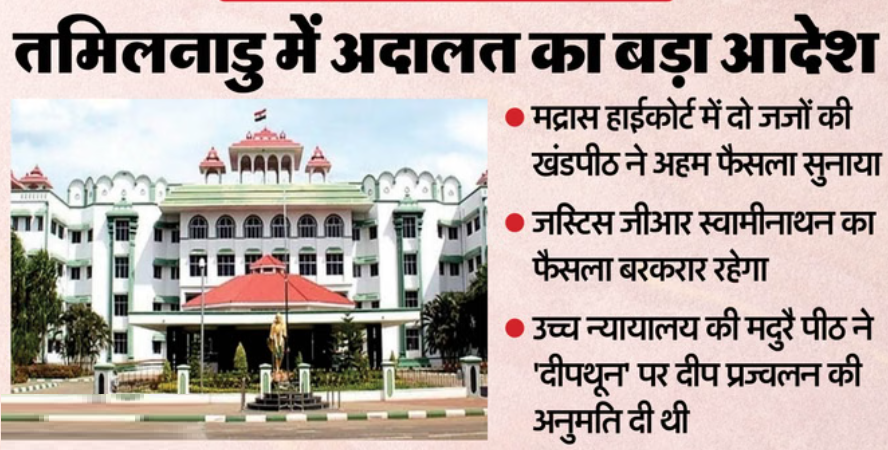 तमिलनाडु के मदुरै में थिरुपरनकुंद्रम पहाड़ी पर स्थित दीपथून में दीपम जलाने के मामले को लेकर मद्रास हाईकोर्ट ने एकल न्यायाधीश के फैसले को बरकरार रखा है। कार्तिगई दीपम विवाद को लेकर मंगलवार को आए मद्रास हाईकोर्ट के इस फैसले को बड़ा फैसला माना जा रहा है।