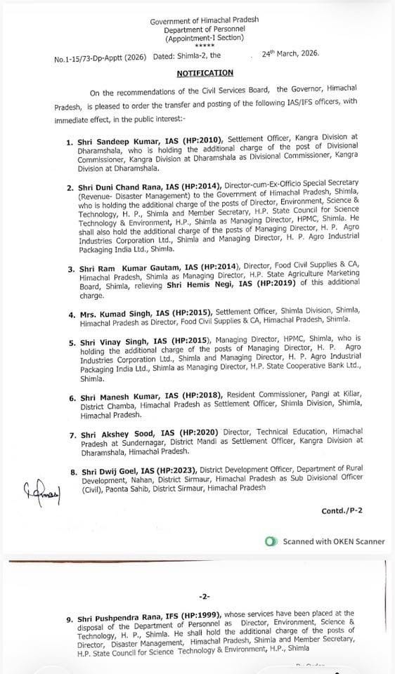 हेमिस नेगी इस अतिरिक्त प्रभार से मुक्त हो जाएंगे। कुमुद सिंह को  निदेशक, खाद्य, नागरिक आपूर्ति एवं उपभोक्ता मामले लगाया है।  विनय सिंह को प्रबंध निदेशक हिमाचल प्रदेश राज्य सहकारी बैंक लिमिटेड के रूप में नियुक्त किया है। मनीष कुमार को सेटलमेंट ऑफिसर शिमला डिवीजन के पद पर नियुक्त किया है।  अक्षय सूद को सेटलमेंट ऑफिसर कांगड़ा मंडल लगाया है।  द्विज गोयल को उप मंडल अधिकारी (सिविल) पांवटा साहिब नियुक्त किया है। आईएफएस अधिकारी पुष्पेंद्र राणा को पर्यावरण, विज्ञान एवं प्रौद्योगिकी विभाग का निदेशक नियुक्त किया गया है। वे निदेशक आपदा प्रबंधन और सदस्य सचिव हिमाचल प्रदेश राज्य विज्ञान, प्रौद्योगिकी और पर्यावरण परिषद (शिमला) के पदों का अतिरिक्त प्रभार भी संभालेंगे।