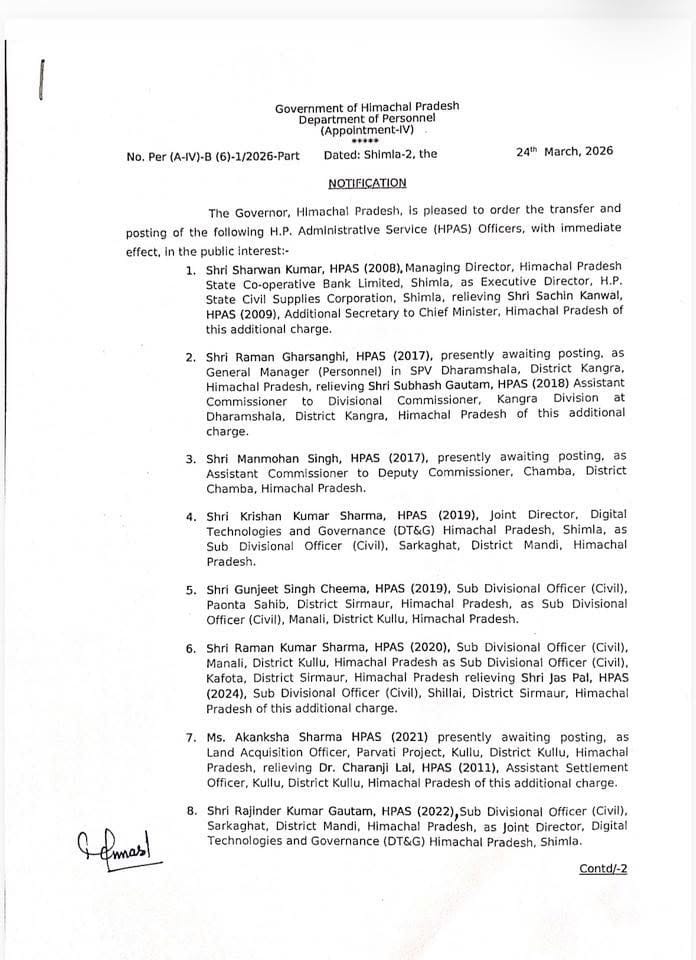 इसी तरह आठ हिमाचल प्रदेश प्रशासनिक सेवा अधिकारियों के तबादले भी किए गए हैं।  इनमें श्रवण कुमार को अब कार्यकारी निदेशक हिमाचल प्रदेश राज्य नागरिक आपूर्ति निगम के पद पर नियुक्त किया है। मुख्यमंत्री के अतिरिक्त सचिव सचिन कंवल  इस अतिरिक्त प्रभार से मुक्त हो जाएंगे। तैनाती की प्रतीक्षा कर रहे रमन घरसंघी को एसपीवी धर्मशाला में महाप्रबंधक (कार्मिक) के पद पर नियुक्त किया है। सुभाष गौतम सहायक आयुक्त मंडलीय आयुक्त कांगड़ा इस अतिरिक्त प्रभार से मुक्त हो जाएंगे। इसी तरह तैनाती का इंतजार कर रहे मनमोहन सिंह को सहायक आयुक्त डीसी चंबा लगाया है।  कृष्ण कुमार शर्मा  को उप मंडलीय अधिकारी (नागरिक) सरकाघाट, गुणजीत सिंह चीमा को उप मंडलीय अधिकारी (नागरिक) मनाली, रमन कुमार शर्मा को उप मंडल अधिकारी (सिविल) कफोटा लगाया है। साथ ही उपमंडल अधिकारी (सिविल) शिलाई जसपाल को इस अतिरिक्त प्रभार से मुक्त किया है। तैनाती का इंतजार कर रहीं आकांक्षा शर्मा को भूमि अधिग्रहण अधिकारी, पार्वती परियोजना कुल्लू लगाया है। सहायक बंदोबस्त अधिकारी कुल्लू डॉ. चरणजी लाल को इस अतिरिक्त प्रभार से मुक्त किया है। राजिंद्र कुमार गौतम को डिजिटल टेक्नोलॉजी एवं गवर्नेंस विभाग में संयुक्त निदेशक नियुक्त किया गया है।