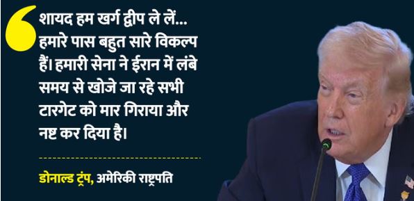 फाइनेंशियल टाइम्स को दिए एक इंटरव्यू में ट्रंप ने कहा कि उनके पास कई सैन्य विकल्प मौजूद हैं। उन्होंने कहा शायद हम खर्ग द्वीप ले लें, शायद नहीं… हमारे पास बहुत सारे विकल्प हैं।खर्ग द्वीप ईरान का सबसे अहम तेल निर्यात हब है, जहां से देश का अधिकांश कच्चा तेल दुनिया भर में भेजा जाता है। ऐसे में इस द्वीप पर कब्जा करना सीधे तौर पर ईरान की अर्थव्यवस्था पर बड़ा झटका होगा।