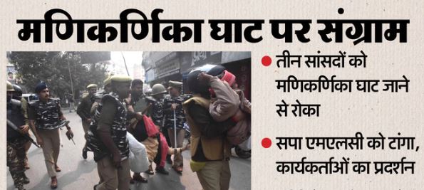 वाराणसी के मणिकर्णिका घाट के विकास और मंदिर के साथ मूर्ति तोड़े जाने के आरोपों के बीच सपा ने रविवार को प्रदर्शन किया। घाट जाने पर अड़े चंदौली से सपा सांसद वीरेंद्र सिंह और बलिया के सांसद सनातन पांडेय को रोक दिया गया। नाराज सनातन पांडेय ने गाजीपुर में चार घंटे तक धरना दिया।