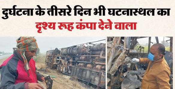 दुर्घटना के तीसरे दिन भी घटनास्थल का दृश्य रूह कंपा देने वाला है। जली हुई 7 डबल डेकर बस व एक रोडवेज बस हों और जली हुई कारों के आसपास हड्डियां, बिखरे हुए कागज, किसी का आधार कार्ड तो किसी यात्री का ड्राइविंग लाइसेंस, पासबुक पड़़ी हुई थीं।