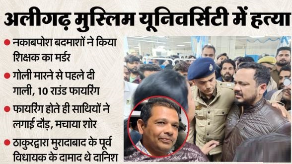 अलीगढ़ के एएमयू के एबीके बॉयज स्कूल के कंप्यूटर शिक्षक राव दानिश अली (45) की बुधवार देर रात एएमयू परिसर में गोली मारकर हत्या कर दी गई। स्कूटी सवार दो नकाबपोश बदमाशों ने इस दुस्साहसिक वारदात को उस समय अंजाम दिया, जब वह लाइब्रेरी की कैंटीन परिसर में दो साथियों संग टहल रहे थे। भागते समय बदमाशों ने करीब 10 राउंड फायरिंग की। इससे एएमयू में दहशत फैल गई।