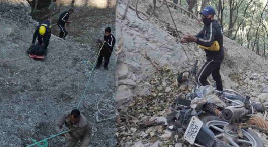 जानकारी के अनुसार, घटना सुबह करीब दस बजे की है। दो युवक देहरादून से पेंट पुताई के काम के लिए मसूरी जा रहे थे। इस दौरान उनकी बाइक 300 मीटर गहरी खाई में गिर गई। सूचना मिलते ही पुलिस मौके पर पहुंची तो देखा खाई में बाइक(बजाज प्लैटिना UK07AB7926) खाई में गिरी हुई थी। एक घायल पहाड़ी पर फंसा हुआ था और दूसरे की मौत हो चुकी थी। एसडीआरएफ की टीम ने घायल को निकालकर अस्पताल भेजा।