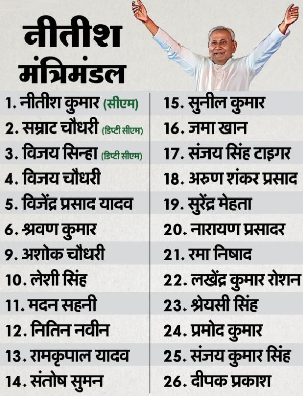 बिहार में मुख्यमंत्री नीतीश कुमार ने 10वीं बार शपथ ले ली है। उनके साथ डिप्टी सीएम के तौर पर सम्राट चौधरी और विजय सिन्हा ने शपथ ली है। इसके बाद राज्यपाल ने छह-छह मंत्रियों को एक साथ शपथ दिलाई। पहले चरण में सीएम-डिप्टी सीएम के बाद विजय चौधरी, विजेंद्र प्रसाद यादव, श्रवण कुमार, मंगल पांडेय, दिलीप जायसवाल और अशोक चौधरी ने शपथ ली।