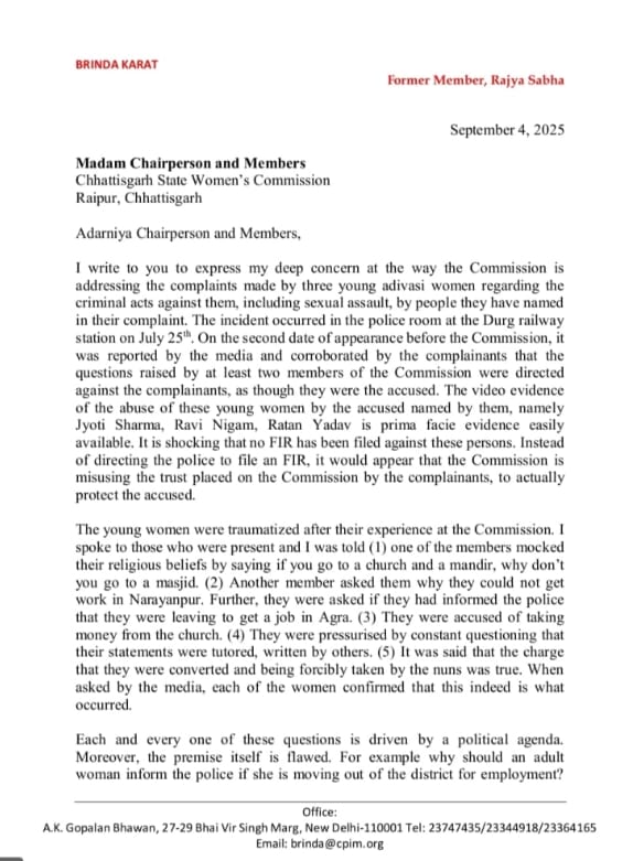 नई दिल्ली मार्क्सवादी कम्युनिस्ट पार्टी के पोलिट ब्यूरो की पूर्व सदस्य, पूर्व राज्यसभा सांसद और देश में महिला आंदोलन की अग्रणी नेता बृंदा करात ने छत्तीसगढ़ राज्य महिला आयोग को एक सख्त पत्र लिखकर उसकी कार्यप्रणाली पर सवाल उठाए हैं। यह पत्र छत्तीसगढ़ के दुर्ग जिले में घटित उस घटना के संदर्भ में है, जिसमें 25 जुलाई 2025 को बस्तर क्षेत्र के नारायणपुर की तीन आदिवासी लड़कियां नौकरी की तलाश में दो ननों के साथ आगरा जा रही थीं, लेकिन दुर्ग रेलवे स्टेशन पर बजरंग दल के कार्यकर्ताओं उन्हें रोककर रेलवे पुलिस की मौजूदगी में उन पर हमला किया, उन्हें अश्लील गालियां दीं और ननों पर जबरन धर्मांतरण और मानव तस्करी का आरोप लगाया था। पुलिस ने बिना जांच के ननों और एक आदिवासी युवक को गिरफ्तार कर लिया था। इस घटना की पूरे देश में प्रतिक्रिया हुई थी और छत्तीसगढ़ और केरल सहित देश के विभिन्न हिस्सों में विरोध प्रदर्शन हुए थे। संसद में प्रदर्शन कर विपक्ष ने भाजपा पर अल्पसंख्यकों के अधिकारों के उल्लंघन का आरोप लगाया था। इस मामले की जांच के लिए स्वयं माकपा नेत्री बृंदा करात और माकपा सांसद जॉन ब्रिटास और अन्य वामपंथी नेता दुर्ग पहुंचे थे और जेल में जाकर ननों से मुलाकात की थी। केरल के भाजपा अध्यक्ष ने भी दुर्ग आकर संघी संगठनों की हरकत और छत्तीसगढ़ में भाजपा राज्य सरकार के रवैए पर ननों से माफी मांगी थी। इन आदिवासी युवतियों को न्याय देने की मांग पर सीपीआई द्वारा नारायणपुर में लगातार आंदोलन किया जा रहा है।