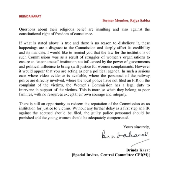 यदि ऊपर कही गई बातें सच हैं और इस पर अविश्वास करने का कोई कारण नहीं है, तो ये घटनाएँ आयोग के लिए कलंक हैं और इसकी विश्वसनीयता और इसके अधिदेश को गहराई से प्रभावित करती हैं। मैं आपको याद दिलाना चाहूँगी कि ऐसे आयोगों के स्थापना के लिए कानून का बनना महिला संगठनों के संघर्षों का परिणाम था, ताकि महिला शिकायतकर्ताओं को त्वरित न्याय दिलाने के लिए एक “स्वायत्त” संस्था सुनिश्चित की जा सके, जो सरकारों की शक्ति और राजनीतिक प्रभाव से प्रभावित न हो। बहरहाल, ऐसा प्रतीत होता है कि आप एक राजनीतिक एजेंडे के अनुसार काम कर रहे हैं। ऐसे गंभीर मामले में जहां वीडियो साक्ष्य उपलब्ध हैं, जहां रेलवे पुलिस के कर्मियों की सीधी संलग्नता हैं, जहां स्थानीय पुलिस ने पीड़ितों की शिकायत पर प्राथमिकी दर्ज नहीं की है, महिला आयोग का कानूनी कर्तव्य है कि वह पीड़ितों के समर्थन में हस्तक्षेप करे। यह तब और भी ज्यादा जरूरी है, जब वे गरीब परिवारों से ताल्लुक रखते हैं, जिनके पास अपने साहस और ईमानदारी के अलावा कोई ताकत नहीं है।
