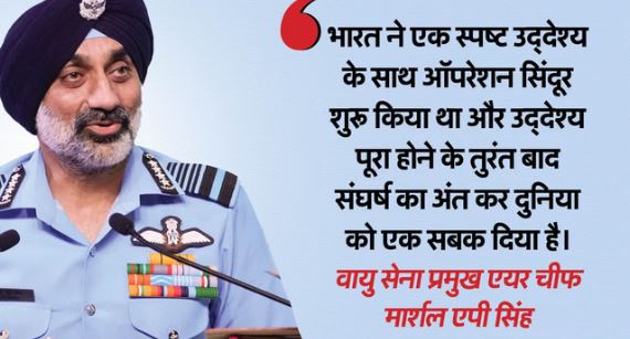 ऑपरेशन सिंदूर पर, भारतीय वायु सेना प्रमुख एयर चीफ मार्शल अमर प्रीत सिंह ने कहा, ‘भारतीय सशस्त्र बलों को संघर्ष को लेकर साफ निर्देश थे। यह एक सबक है जो इतिहास में दर्ज होगा कि यह एक ऐसा युद्ध था जो एक बहुत ही स्पष्ट उद्देश्य से लड़ा गया था और लक्ष्य हासिल होने के बाद इसे बिना आगे बढ़ाए हुए तेजी से समाप्त कर दिया गया। हम देख रहे हैं कि दुनिया में क्या हो रहा है, दो युद्ध चल रहे हैं और फिलहाल उनके खत्म होने की कोई बात नहीं चल रही है। लेकिन हमने लड़ाई को उस स्थिति में पहुंचाया, जहां वे हमसे युद्धविराम की मांग करें। इसके बाद हमने एक राष्ट्र के रूप में संघर्ष को समाप्त करने का फैसला लिया क्योंकि हमने जिन उद्देश्यों से लड़ाई शुरू की थी, वो पूरे हो चुके थे। मुझे लगता है कि ये कुछ ऐसा है, जिसे दुनिया को हमसे सीखने की जरूरत है।’