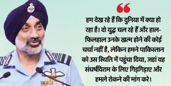 ऑपरेशन सिंदूर में पाकिस्तान को हुए नुकसान की जानकारी देते हुए वायुसेना प्रमुख ने कहा कि ‘जहां तक ऑपरेशन सिंदूर में पाकिस्तान को हुए नुकसान की बात है, हमने उनके कई एयरफील्ड और सैन्य ठिकानों को निशाना बनाया। हमारे हमलों के चलते उनके कम से कम चार रडार्स, दो कमांड और कंट्रोल सेंटर, दो जगहों पर रनवे, तीन अलग-अलग जगहों पर स्थित उनके हैंगर्स को नुकसान पहुंचाया। हमारे पास सबूत हैं कि उनका एक सी-130 श्रेणी का विमान, कम से कम चार से पांच लड़ाकू विमान, जिनमें एफ-16 शामिल हैं, इनके साथ ही एक एसएएम सिस्टम को भी तबाह किया गया। हमारे पास इसके पुख्ता सबूत हैं और हमारे सिस्टम से ये जानकारी मिली है।’