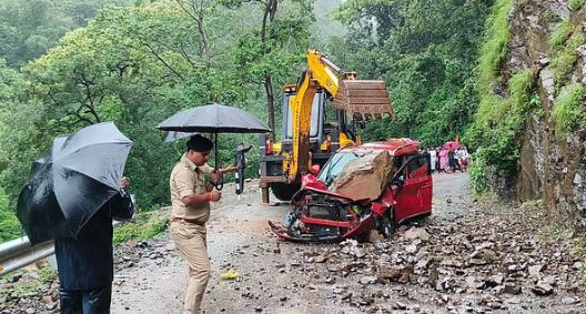 ऋषिकेश: नीलकंठ मार्ग पर पहाड़ी से कार के ऊपर गिरा भारी पत्थर, बाल-बाल बचे यात्री, यातायात बंद