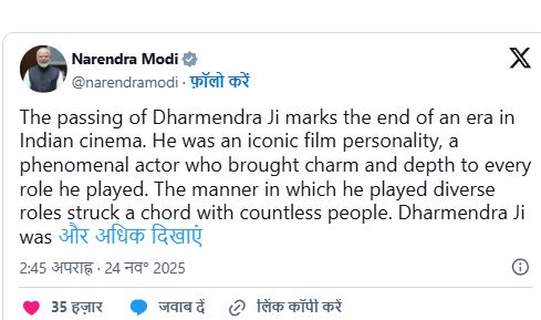 प्रधानमंत्री नरेंद्र मोदी ने धर्मेंद्र के निधन पर दुख जताया है। उन्होंने दिवंगत एक्टर को श्रद्धांजलि देते हुए लिखा है, ‘धर्मेंद्र जी के जाने से भारतीय सिनेमा में एक युग का अंत हो गया है। वह एक आइकॉनिक फिल्म पर्सनैलिटी थे। एक जबर्दस्त एक्टर थे, जो अपने हर रोल में आकर्षण और गहराई लाते थे। जिस तरह से उन्होंने अलग-अलग किरदान निभाए, अनगिनत लोगों के दिलों को छू लिया। धर्मेंद्र जी अपनी सादगी, विनम्रता और प्यार के लिए भी उतने ही जाने जाते थे। इस दुख की घड़ी में, मेरी दुआएं उनके परिवार, दोस्तों और अनगिनत फैंस के साथ हैं। ओम शांति’।