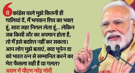 प्रधानमंत्री ने कहा कि ‘ये कांग्रेस वाले मुझे कितनी ही गालियां दे, मैं भगवान शिव का भक्त हूं, सारा जहर निगल लेता हूं, लेकिन जब किसी और का अपमान होता है, तो मैं इसे बर्दाश्त नहीं कर सकता। आप लोग मुझे बताएं, क्या भूपेन दा को भारत रत्न से सम्मानित करने का मेरा फैसला सही है या गलत?’