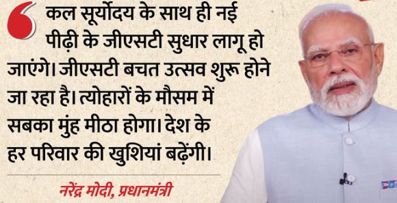 पीएम मोदी ने कहा कि जीएसटी बचत उत्सव में आपकी बचत बढ़ेगी और आप अपनी पसंद की चीजों को और ज्यादा आसानी से खरीद पाएंगे। हमारे देश के गरीब, मध्यम वर्गीय लोग, न्यू मिडिल क्लास, युवा, किसान, महिलाएं, दुकानदार, व्यापारी, उद्यमी, सभी को ये बचत उत्सव का बहुत फायदा होगा। यानी त्योहारों के इस मौसम में सबका मुंह मीठा होगा।