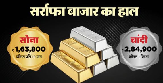 - दिल्ली: 24 कैरेट सोना ₹1,63,800 प्रति 10 ग्राम | चांदी ₹2,84,900 प्रति किलोग्राम।