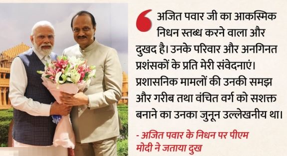 पीएम मोदी ने लिखा, ‘अजित पवार जी लोगों के नेता थे, जिनका जमीनी स्तर पर मजबूत संबंध था। उन्हें महाराष्ट्र के लोगों की सेवा में मेहनती और समर्पित व्यक्ति के रूप में व्यापक सम्मान मिला। प्रशासनिक मामलों की उनकी समझ और गरीब व वंचितों को सशक्त बनाने का उनका जुनून भी उल्लेखनीय था। उनका आकस्मिक निधन बेहद स्तब्ध करने वाला और दुखद है। उनके परिवार और अनगिनत प्रशंसकों के प्रति मेरी संवेदनाएं। ॐ शांति।’