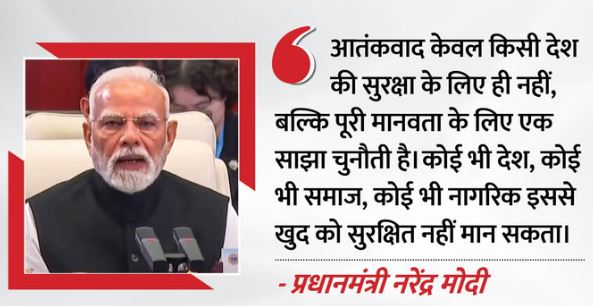 उन्होंने कहा, ‘यह हमला न केवल भारत की अंतरात्मा पर आघात था, बल्कि यह हर उस देश, हर उस व्यक्ति के लिए एक खुली चुनौती थी, जो मानवता में विश्वास रखता है।’ प्रधानमंत्री ने कहा कि आतंकवाद से निपटने के लिए एससीओ को एकजुट होकर काम करना चाहिए। उन्होंने कहा कि हमें स्पष्ट रूप से और सर्वसम्मति से कहना होगा कि आतंकवाद पर कोई भी दोहरा मापदंड स्वीकार्य नहीं होगा। हमें आतंकवाद के सभी रूपों और रंगों का मिलकर विरोध करना चाहिए।