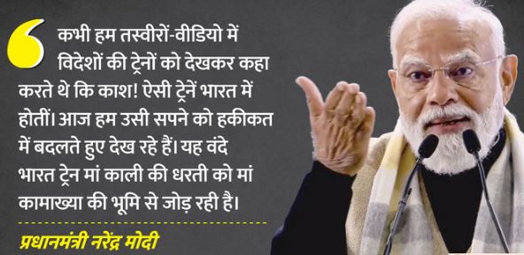 - ‘देश की ये पहली वंदे भारत स्लीपर ट्रेन, मां काली की धरती को मां कामाख्या की भूमि को जोड़ रही है। आने वाले समय में पूरे देश में, इस आधुनिक ट्रेन का विस्तार होगा। मैं बंगाल को, असम को, पूरे देश को इस आधुनिक स्लीपर ट्रेन के लिए बधाई देता हूं। आज भारतीय रेल आधुनिक होने के साथ-साथ आत्मनिर्भर भी हो रही है। ये वंदे भारत ट्रेन मेड इन इंडिया है, इसे बनाने में भारतीयों का पसीना लगा है।’