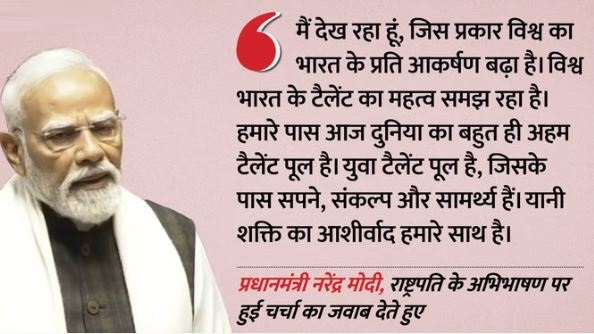 उन्होंने कहा, दूसरी तरफ मैं देख रहा हूं जिस प्रकार विश्व का भारत के प्रति आकर्षण बढ़ा है। विश्व भारत के प्रतिभा (टैलेंट) का अहमियत समझ रहा है। हमारे पास आज दुनिया का बहुत ही अहम टैलेंट पूल है। युवा टैलेंट पूल है, जिसके पास सपने, संकल्प और सामर्थ्य है। यानी शक्ति का आशीर्वाद हमारे साथ है।