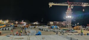 (8) अक्टूबर 2021 – जनवरी 2022 के मध्य भूमिगत RCC की ऊपरी सतह पर, और अधिक उच्च भार वहन क्षमता की एक और 1.5 मीटर मोटी सेल्फ-कॉम्पैक्टेड कंक्रीट RAFT (लगभग 9,000 क्यूबिक मीटर मात्रा में) को 9MtrX 9Mtr के आकार के खंडों में बैचिंग प्लांट, बूम प्लेसर मशीन और मिक्सर का उपयोग करके डाला गया था। । RAFT के निर्दोष निर्माण के इस चरण में IIT-कानपुर के एक प्रोफेसर और परमाणु रिएक्टर से जुड़े एक वरिष्ठ इंजीनियर ने भी योगदान दिया।