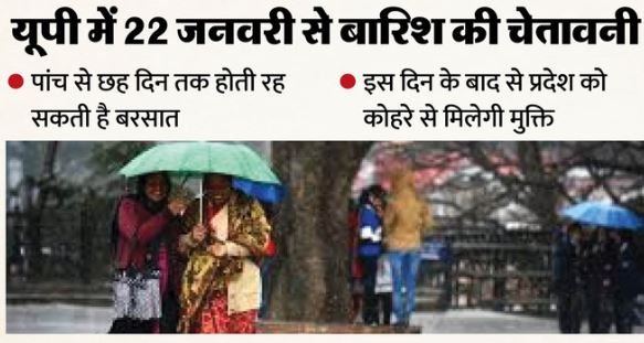 प्रदेश में कोहरे में आई कमी के साथ ठंड से राहत मिली है जो आगे भी जारी रहने की संभावना है। मौसम विभाग के अनुसार, आगामी 48 घंटों में तापमान में थोड़ी गिरावट के उपरांत उत्तरोत्तर दो पश्चिमी विक्षोभों के प्रभाव से 22 जनवरी से प्रदेश में वर्षा की संभावना है। पश्चिमी उत्तर प्रदेश से इसकी शुरुआत होगी और वहां बृहस्पतिवार को हल्की बारिश होगी।