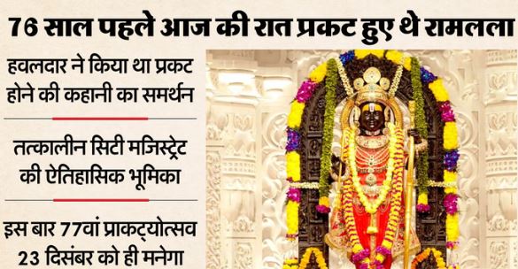 राम जन्म भूमि सेवा समिति उसी वर्ष से लगातार रामलला का प्राकट्य उत्सव मनाती आ रही है। संयोग है कि इस बार 77वां प्राकट्योत्सव 23 दिसंबर को ही मनेगा, इसलिए 1949 की घटना को याद करना मौजू हो उठता है।
