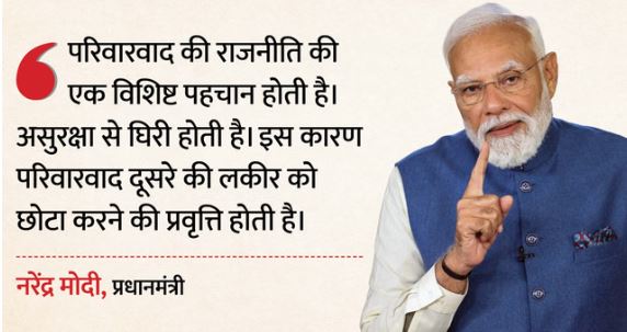 पीएम नरेंद्र मोदी ने गुरुवार को लखनऊ में राष्ट्र प्रेरणा स्थल का उद्घाटन किया। इस दौरान कार्यक्रम को संबोधित करते हुए उन्होंने कहा, एक परिवार ने देश को बंधक बनाया था, भाजपा की सरकार ने उसे मुक्त कराया। परिवारवाद की राजनीति की एक विशिष्ट पहचान होती है। असुरक्षा से घिरी होती है। इस कारण परिवारवाद दूसरे की लकीर को छोटा करने की प्रवृत्ति होती है। इसी सोच ने भारत में राजनीतिक छूआछूत का चलन शुरू किया।
